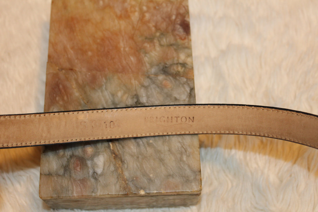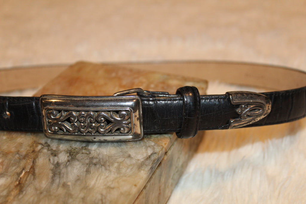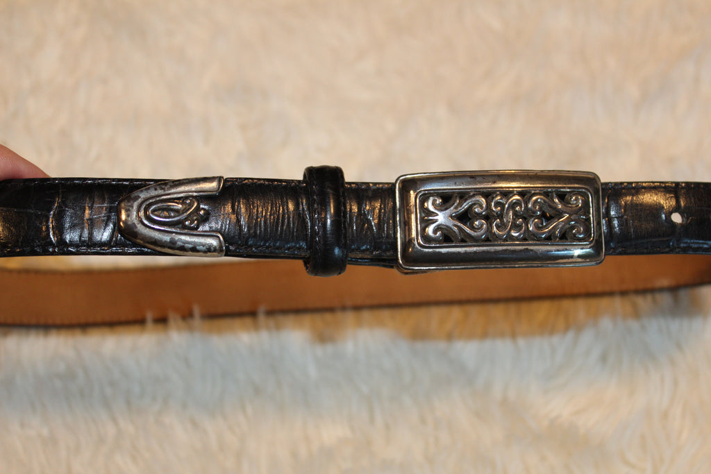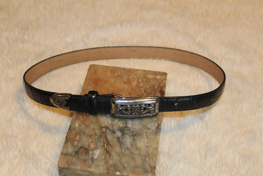 Brighton Vintage Brighton Belt is a stylish accessory, featuring a silver tone buckle and tip on a black croc embossed leather slender belt. The belt has a skinny width of 3/4", making it versatile for various occasions such as golf, western, work, or dressy events. The classic solid design and vintage appeal add a touch of sophistication to any outfit, making it a must-have for those who appreciate quality and timeless fashion.
